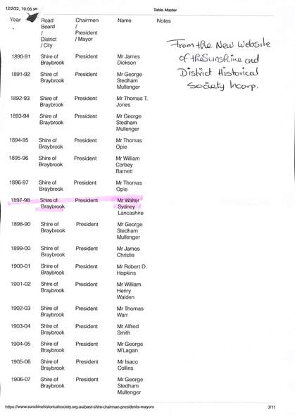 Walter Sydney Lancashire was elected the Shire of Braybrook President in 1897. Walter served for one term 1897 - 1898. He lived with his mother in Chapman Street Braybrook Junction (Renamed to Sunshine).