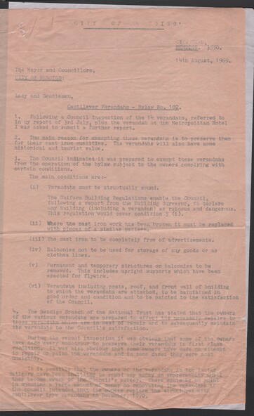 National Trust - A two-page report (in letter form dated 14 August 1969) to Councillors following Councils inspection on 3rd July of the verandahs/properties to 15 properties as referred to Council regarding the retention of these post verandahs. The letter lays out six proposed conditions on the retention of these verandahs, and that the owners be advised of four conditions under which the post/cast-iron verandahs will be exempt of the By-Law 102.