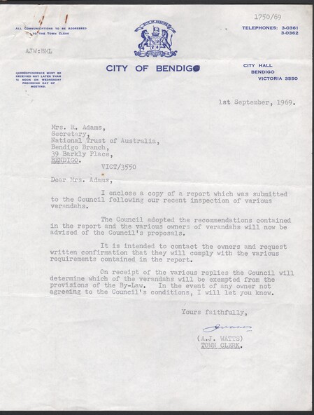 National Trust - Single page letter, signed by Town Clerk, A.J. Watts, advising the National Trust (Bendigo Branch) of Council's actions/status of considerations of retention of a limited number of cast-iron/post. Letter on City of Bendigo letterhead and signed by the Town Clerk.