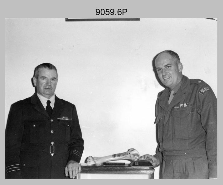 .6) - Photo, black & white, c1961, Evening trophy presentations. L to R: unidentified RAAF School of Radio’s CO/or representative, AHQ Survey Regiment CO’s representative MAJ John Nolan.