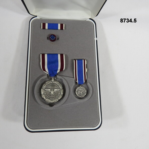 1. Medal box with gold decoration. 2. USA Civilian medal, Office of the Secretary of Defence. 3. Miniature Medal, USA Civilian Medal, Office of the Secretary of Defence. 4. USA Civilian medal ribbon. 5. Rosette USA Civilian Medal.