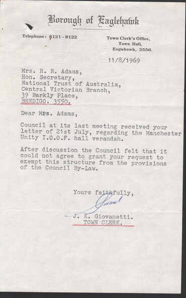 3097.11A 11/08/1969 signed letter to National Trust of Australia, Bendigo Branch from Borough of Eaglehawk advising the Shire could not agree to exempt the verandah to the Hall from Council's By-Law