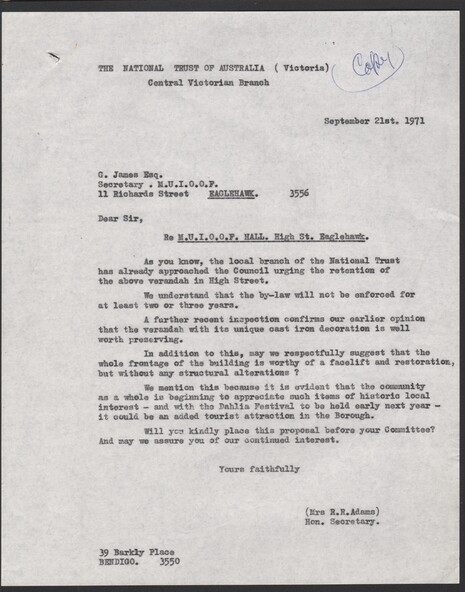 3097.11B 21/09/1971 letter from the National Trust of Australia, Bendigo Branch to the Secretary of the M.U.I.O.O.F. Hall advising that an inspection by the Trust considers the "verandah with its unique cast iron decoration is well worth preserving".