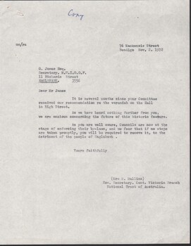 National Trust - three letters regarding the retention of the verandah to the M.U.I.O.O.F. Hall High Street Eaglehawk