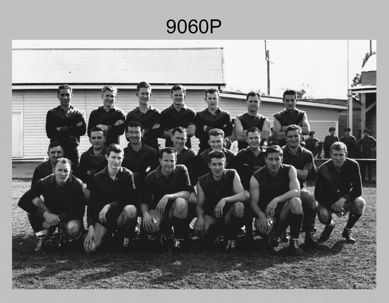 This is a group photograph of the Army Headquarters (AHQ) Survey Regiment Australian Rules Football Team - Fortuna Villa, Bendigo Victoria, 1962. The team in this photograph competed in either a local Bendigo competition, an inter-area Army tournament or a Puckapunyal Area Competition.