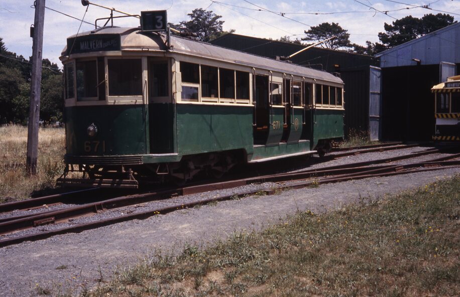 Set of 3 colour slides of BTPS ex MMTB W4 class tram 671 in use in Wendouree Parade, at its commissioning 25-10-1980 (based on tramcar use sheets for 671 and 14). First photo is of the tram standing on the depot fan, second running it at depot junction and operating with tram 14.