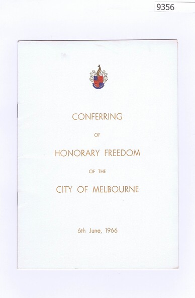 Booklet recording the Honorary Freedom Of the City of Melbourne presented to Sir Robert Menzies 1966. This function was attended by the Morgans.