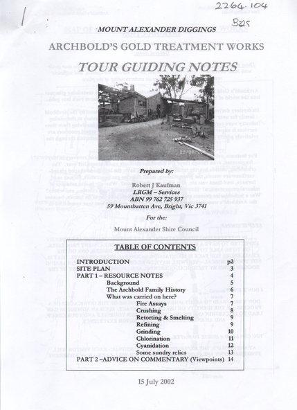 Nineteen page document. On front page: ' Mount Alexander Diggings, Archbold's Gold Treatment Works, Tour Guiding Notes, prepared by Robert J. Kaufman, Prepared for the Mount Alexander Shire Council, 2002. The processes used in the treatment plant are described, including: fire assays, crushing, retorting and smelting, refining, grinding, chlorination, and cyanidation. The Archbold family history and an overview of the gold treatment works overall, is presented in the report. Black and white photographs and diagrams of various artefacts and processes are included. Advice on commentary from each viewpoint on the tour, is provided for tour guides.