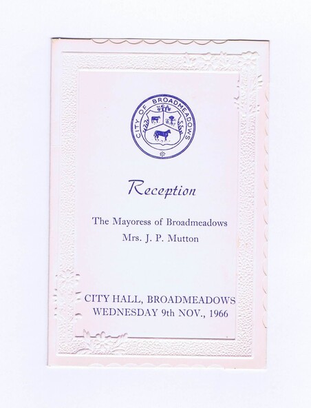 Program for the City of Broadmeadows Mayoress Reception 9th November 1966. This function was attended by Mavis Morgan.
