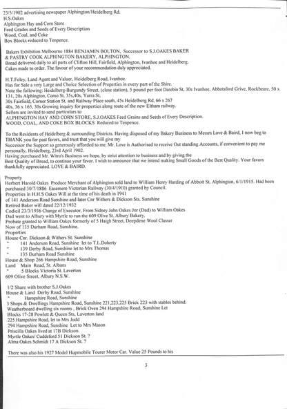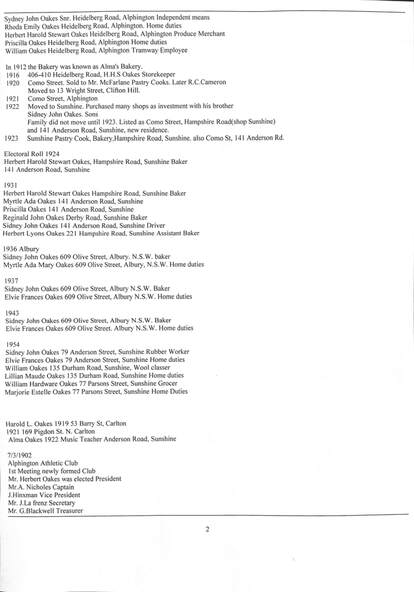 The Herbert Oakes and his family lived and worked in Sunshine. Over the years the electoral roles and the Sands & McDougall Directories had the family listed at multiple properties including 221 Hampshire Road, 135 Durham Road, 141 Anderson Road, 77 Parsons Street & Derby Road.