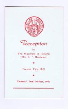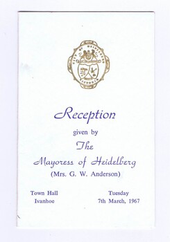 1. Program for City of Heidelberg Mayoress Reception. 2. Program for City of Preston Mayoress Reception. These functions were attended by Mavis Morgan.