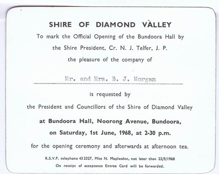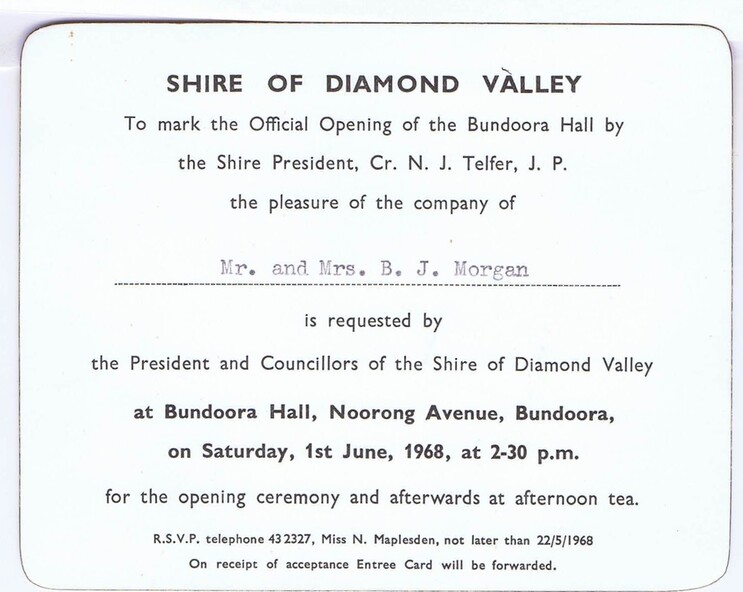 Invitation and Souvenir Brochure to the Official Opening of the Bundoora Hall. This function was attended by the Morgans.