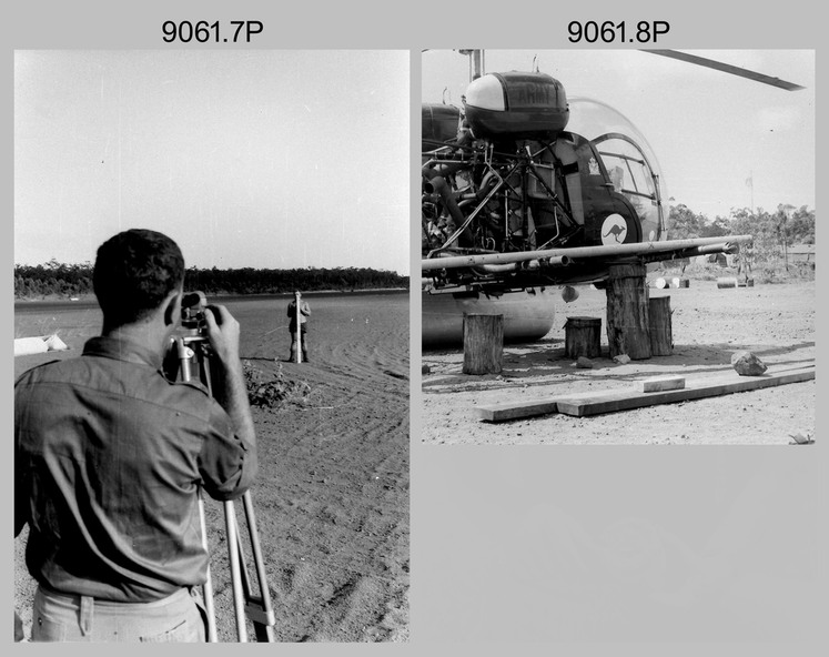 This is a set of 26 photographs of Royal Australian Survey Corps (RA Svy) personnel from Central Comd Fd Svy Unit (Adelaide) on Aerodist survey operation - Project C4 in Eastern Arnhem Land, Northern Territory in 1967 (photos .4P to .26P) and in Western Arnhem Land, Northern Territory in 1968 (photos .1P to .3P). Photos of personnel were taken either at the operations base at Numbulwar or the main base at Gove (Nhulunbuy). RA Svy conducted nineteen Aerodist operations for 12 years from 1964 to 1975. Aerodist MRC2 was a tellurometer-based system adapted for aircraft to accurately measure distances between non-intervisible ground survey stations, using the aircraft as an intermediate station. Lower order geodetic results could be achieved by survey network trilateration. The measured distances between stations formed survey networks from which each station’s latitude and longitude was computed. Aerodist MRC2 was RA Svy’s major horizontal control survey tool for mainly medium scale topographic mapping (scale 1:100,000 Class A being spatially accurate to within 50 metres) in PNG, northern NT, north-west WA, Kalimantan Barat (West) Indonesia, Sumatra Indonesia, Gulf of Carpentaria and Cape York, QLD. In 1967, the Aerodist MRC2 Master equipment was installed in the aircraft featured in this set of photos, Executive Air Services’ (Essendon VIC) Grand Aero Commander VH-EXX. It was the same aircraft type and company contracted to Division of National Mapping for Aerodist MRC2 surveys. From July to October 1967 the aircraft was attached to Central Comd Fd Svy Unit (Adelaide - Major Don Ridge) on Project C4 eastern-Arnhem Land NT, where 317 Aerodist lines measuring 17,300 line miles were successfully completed. This was the most productive Aerodist project thus far. The most common helicopter used by RA Svy up to 1972 was the civilian Bell 47G-2 and the Sioux Light Observation Helicopters (LOH), the Australian Army’s equivalent featured in this photo set. These light observation helicopters had a limiting load carrying capacity of up to about 500 pounds. By comparison, one Aerodist team including two people weighed up to 1,500 pounds. In 1968, after completion of the Kimberley Aerodist Operation project, the Aerodist system in VH-EXX was immediately deployed to western-Arnhem Land NT for Central Comd Fd Svy Unit (Adelaide - Major Don Ridge) to complete the mapping control across northern NT from mid-July to October.