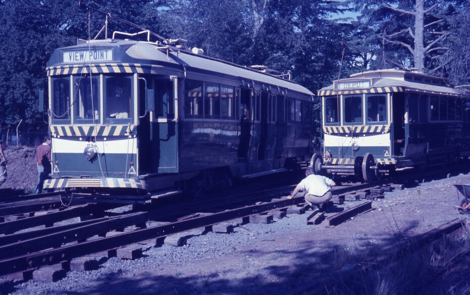 Colour slide of trams 40, and 26 being shunted at the depot to rearrange trams in the depot building - see Feb. 1973 Fares Please for a report on this event. Rolf Jinks is watching the wheels passing over joints. Photo by David Frost 11/2/1973.