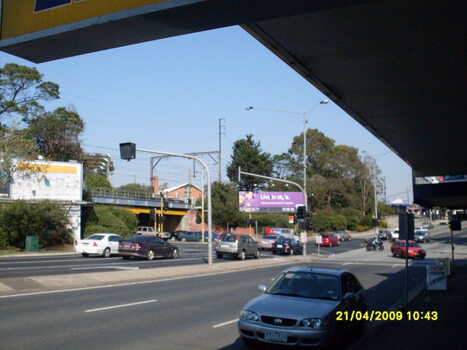 Ron Brons photographic study of Ringwood. Showing advertising signs, railway line and top of the Ringwood Uniting Church.