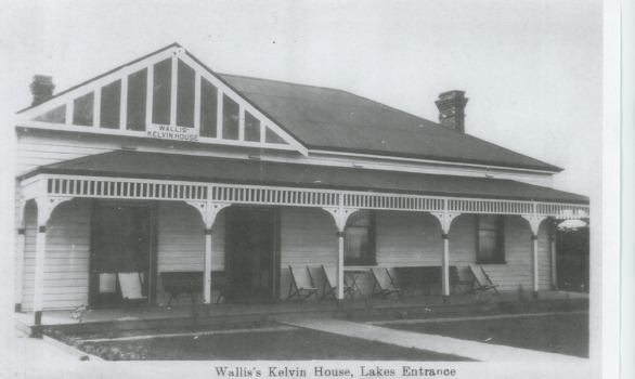 a Black and white photograph of a weatherboard guest house with a corrigated iron roof situated on the Esplanade