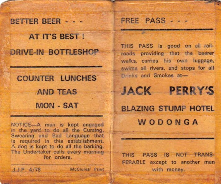 Two small cards from Jack Perry's Blazing Stump Hotel Wodonga. Used as a business promotion in the 1970s.