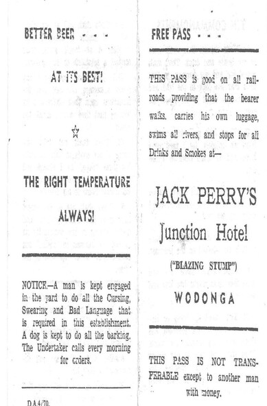 John Henry Perry, known as "Jack" arrived in Wodonga in May 1929 with his wife and children. He took over the licence of the Junction Hotel, now known as "The Stump", Bandiana from Mr. Bill Carter. Prior to this he had worked in 3 Australian states as a shearer. He held the licence until 1941 when he passed it over to his son John ("Jack").