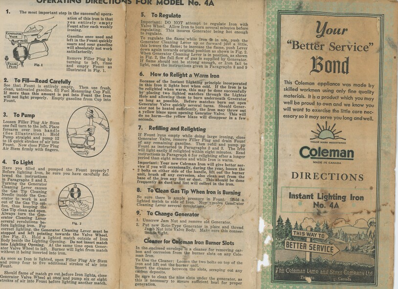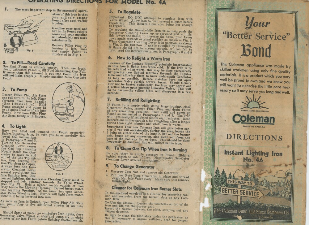 Coleman 4A Instant Lighting Irons were made between 1929 and 1948. This brochure with its operating directions and service instructions would assist the user to repair their Coleman iron themselves. Petrol irons were useful in areas like Emerald without reliable electricity. Overheating, spillage, toxic exhaust gases and (sometimes) explosions were all possibilities to be avoided through careful monitoring by the user.