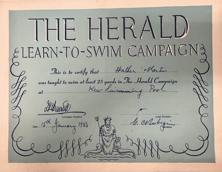 A Herald:'Learn-to-Swim Campaign' certificate awarded to Heather Martin who was taught to swim 25 Yards at the Kew Swimming Pool on 15 January 1953