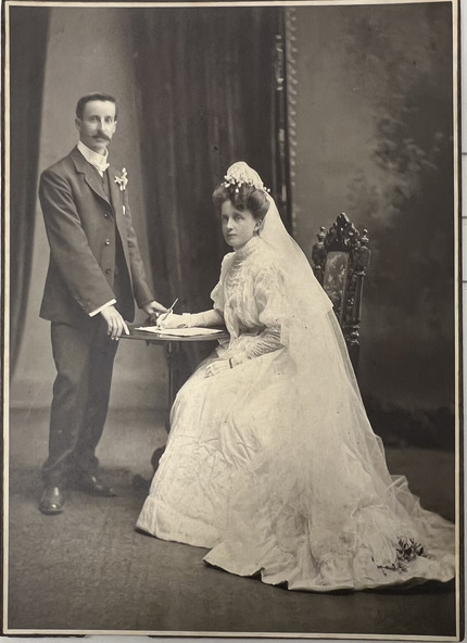 Original cabinet card studio portrait of a bride and groom.