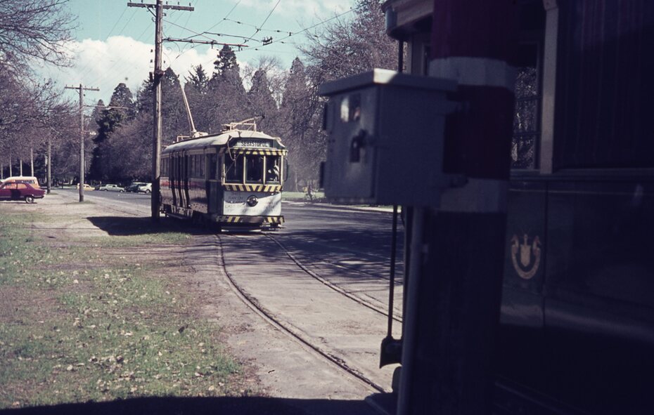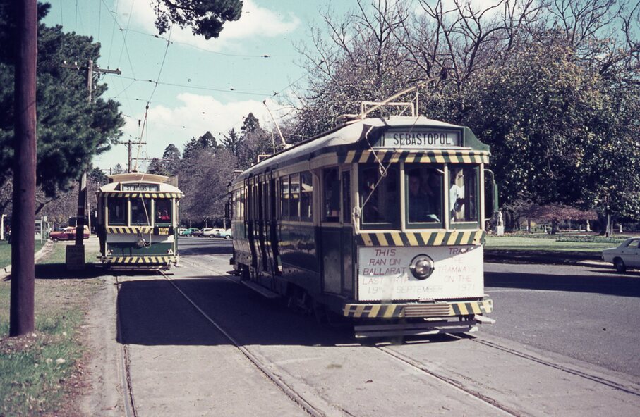 Set of two colour slides taken on 19/9/1976 to celebrate the 5th anniversary of the closure of the SECV operated system. Tram 40 carries a celebratory headboard and tram 14 was run in conjunction with the event. See Oct. 1976 issue for Fares Please! for details. Photos by David Frost. A BTPS telephone box is mounted to the pole in the photograph.