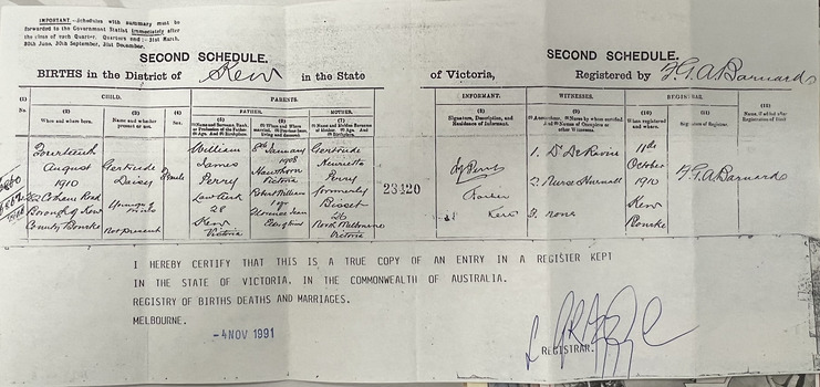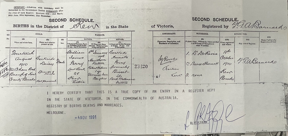 Certified copy of a birth certificate for Gertrude Daisy Perry, issued by the Registry of Births Deaths and Marriages, Victoria, in 1991. The certificate was originally issued on 14th August 1910 at 282 Cotham Road Kew. The parents of Gertrude Perry are identified as William James Perry, Law Clerk, 28, Kew, Victoria; and Gertrude Henriette Perry, formerly Bisset, 26, North Melbourne, Victoria. The certificate records that the parents were married on 8th January 1908 in Hawthorn. It notes the names of the child's siblings as Robert William Perry, 1 year, and Florence Jean Perry. Amongst additional information is the signature of F.G.A. Barnard, Registrar [of births in Kew].