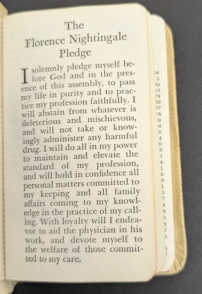 On front end page is printed Presented to' Anne L Bryant/ 10 Acheron Court/ Moorabbin/ 95.3362 3189/ 1:8:1969 [handwritten in black ink]. Inside front cover at base is a white sticker with blue print 'this testament is the gift of the Auxiliary of the Gideons International in Australia. Florence Nightingale pledge is also included