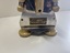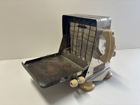 Nickel plated toaster with porcelain handles and feet with hinged metal flaps. Electric cord is missing