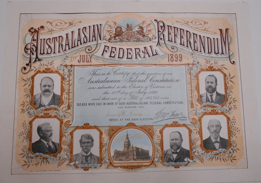 Framed certificate from Australasian Federal Referendum, paper on card under glass and framed with brown timber frame, shades of blue, gold and brown with black lettering, photographs of six state Premiers underneath a coat of arms and showing Victoria's Parliament House. Written on address: 'This is to certify that the question of an Australasian Federal Constitution was submitted to the electors of Victoria on the 27th day of July 1899 and that out of a poll of 163,783 votes, 152,653 were cast in favour of such Federal Australasian Constitution and further, that James H Craig voted at the said election'.