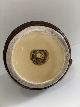 Cream and tan spotted porcelain body with a black bakelite swivel lid. Electrical lead is missing.