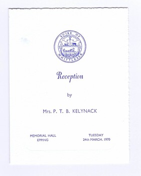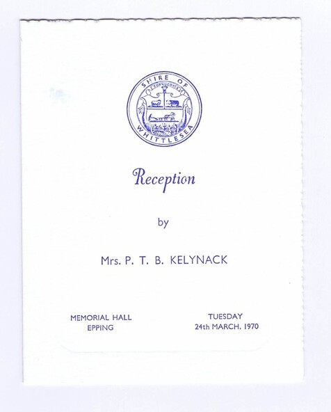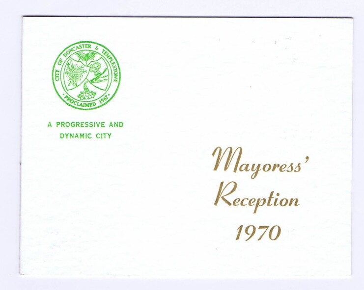 Program for Shire of Whittlesea Reception by Mrs P T B Kelynack 24/03/1970; and, Invitation to City of Doncaster & Templestowe: Mayoress' Reception 09/04/1970. Both attended by Mavis Morgan.