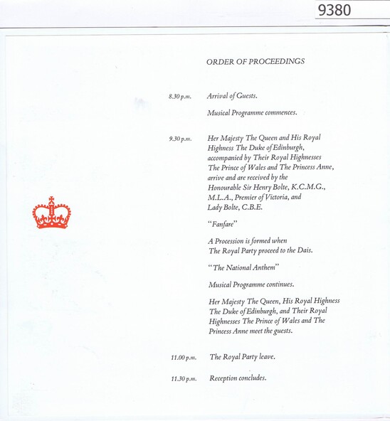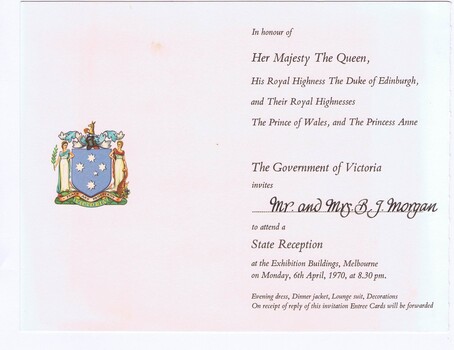Invitation and program for the Victorian State reception for the Royal visit to Melbourne on 06/04/1970.