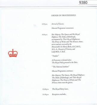 Invitation printed on cream card with state crest; and program (2 copies) red cover 5 p., with colour photograph and plan. includes parking pass.