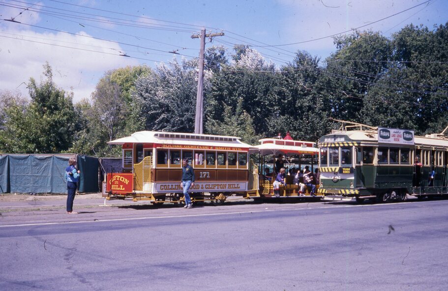 Set of five colour slides of the Newton Williams and Darryl Hawksworth motorised cable tram set operating in Wendouree Parade during the 1987 March Begonia Festival. Photos by David Frost.