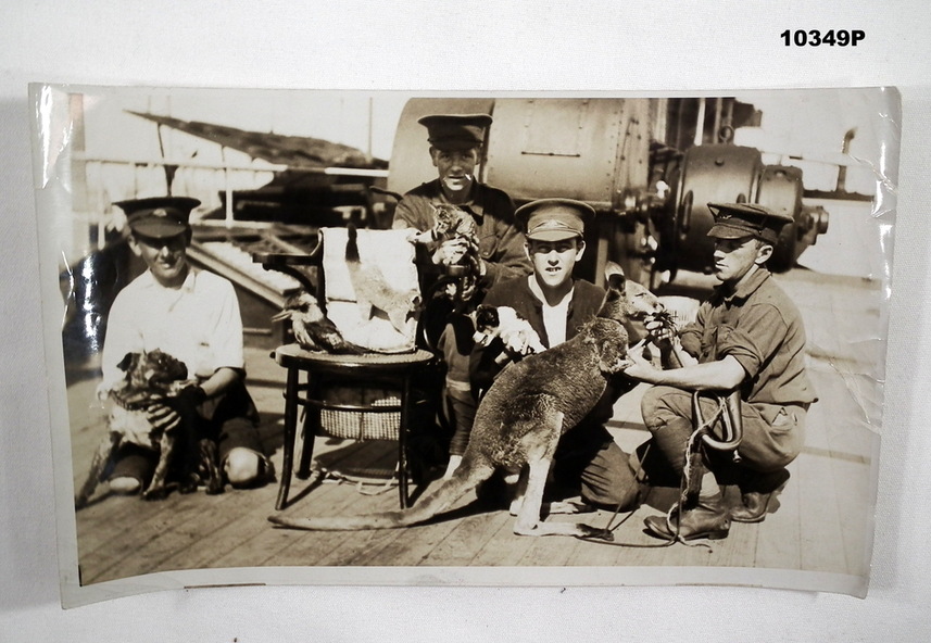 Black and white landscape photograph of four Australian Servicemen with six ships mascots including 2 dogs, a wallaby, cat, kookaburra and possibly a possum. The kangaroo belongs to the Australian Unit. the photo is taken on the deck of the ship. A descriptive sticker is attached to the back.