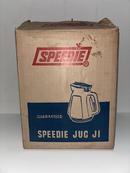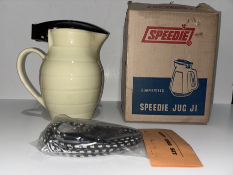 The Speedie electric jug is a classic piece of Australian domestic appliance history, known for its distinctive ceramic body and early electric heating design. This is rare piece as it is in new condition including electrical cord and box.