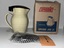 A primrose color electric jug with box and electrical cord. A page of the Hearld Sun dated 21st January 1968 is inside the jug.