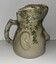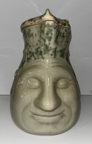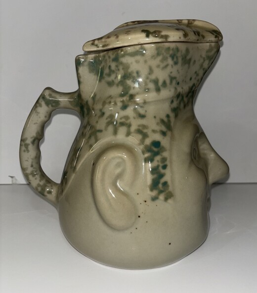 The electric jug has a green molted feature, the lid is slighter darker than the jug body, a clean glazed makes it shine in appearance. The jug features a person's face, eyes, nose, Mouth & ears.