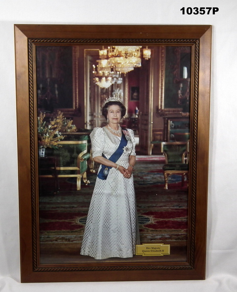 Photograph - colour, full length formal portrait of Queen Elizabeth II, standing in a furnished room. Lower right small scroll shaped name label with the words, "Her Majesty/ Queen Elizabeth II", Printed on photographic paper.