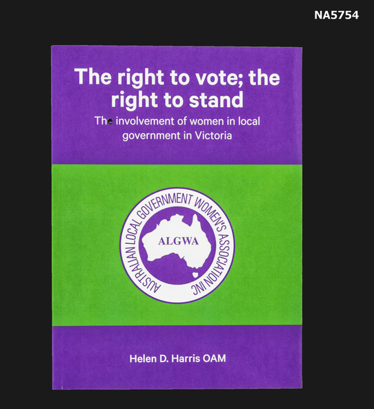 Purple and green book titled "The right to vote: the right to stand". The involvement of women in local government in Victoria. In centre of book map of Australia with ALGWA in centre. Circle around has "Australia Government Women's Association" book by Helen D. Harris OAM. Book has 93 pages.