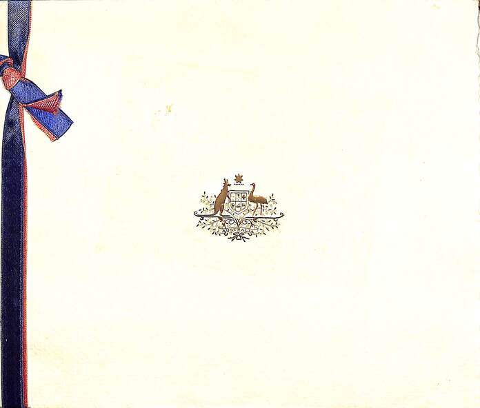 Buff bifold card with a gold Commonwealth of Australia Coat of Arms on front cover. A blue and orange ribbon binds the left edge of the front page