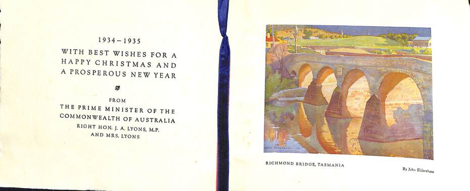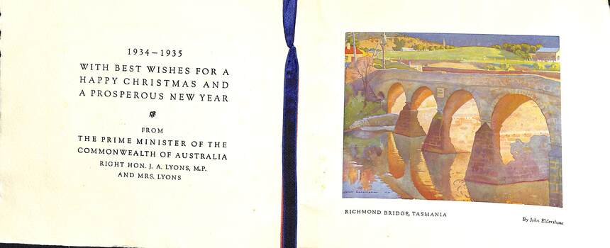 Page 3 has a multicoloured print of Richmond Bridge in Tasmania - the original painting done by John Eldershaw. Joseph Lyons was a resident and MP for Tasmania. This Christmas card is part of a collection of invitations and cards sent to the people of Maroondah. Addressee is unknown.