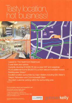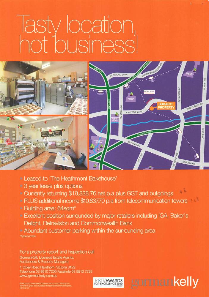 Currently leased to "The Heathmont Bakehouse". Handwritten agents' sales notations on some pages. Agents - Gorman Kelly Licensed Estate Agents Auctioneers & Property Managers, 1 Oxley Road Hawthorn, Victoria 3122. Telephone 03 9810 7200 Facsimile 03 9810 7299.