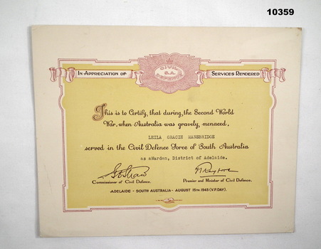 Certificate - CIVIL DEFENCE CERTIFICATE, WW2