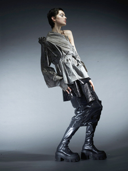 The leather layering piece is made from deadstock leather and fully hand-stitched, while the skirt is also created from deadstock fabric. I believe that fashion should empower, inspire, and transcend, inviting wearers to express who they are without limits.