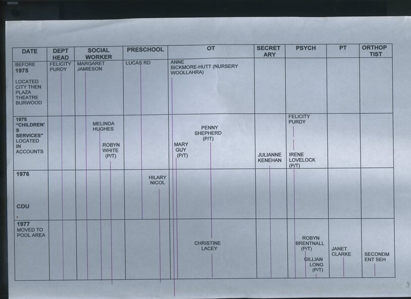 Staffing outline of the Client Services unit from circa 1975 to 1988, as created by Mary Guy. It covers the timeline of staff entering the unit, including Department Head, Social Worker, Preschool, Occupational Therapy, Secretary, Psychology, Physical Therapy and Orthoptist, as well as some location changes: