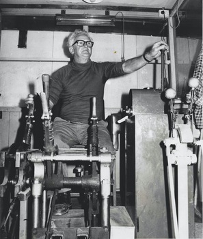 Black and white photograph: engine driver sitting at controls of winding engine with left hand on lever. Mine not named on image but possibly Wattle Gully Gold Mine, Chewton.