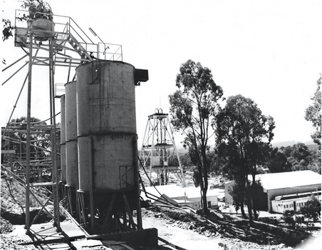 Black and white photograph: view of Wattle Gully mine site with ore bins, poppet head and mining sheds. Eucalypt trees in centre of image.