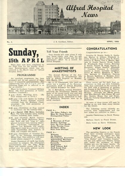 Newsletter - Illustrated newsletter, J E Goreham, Alfred Hospital News, April 1956, April 1956